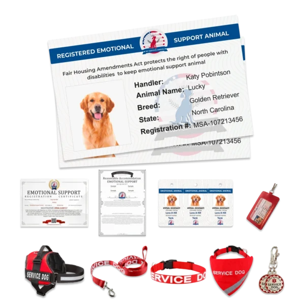 An Emotional Support Dog Full Kit Registration Bundle is a package offered by MyServiceAnimal that provides owners of emotional support animals with all the necessary items and documents to register their pets as emotional support animals. An ESA bundle is a comfortable solution for those who want to quickly get all the essentials for their animal without spending too much time on it.