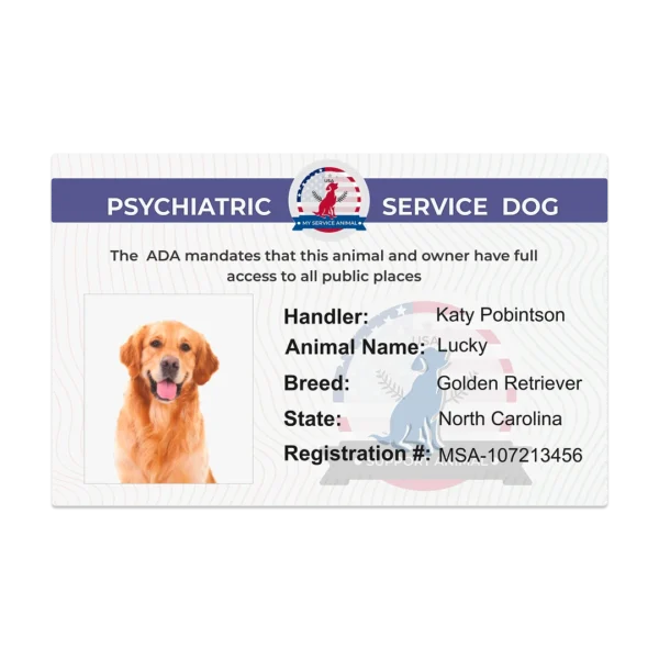 Psychiatric service dogs are trained to perform tasks that support mental health–related disabilities. Clear identification helps communicate their working role, making public access, travel, and housing interactions smoother.
